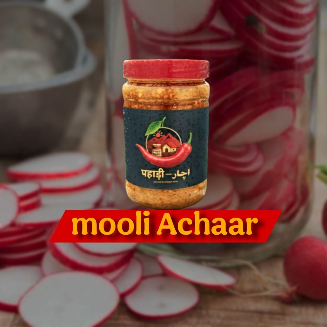 Pahadi Mooli Achaar – Spicy Mountain Freshness in Every Bite!Bring home the bold, earthy flavors of the Himalayas with Pahadi Mooli Achaar — a traditional radish pickle crafted in small batches using fresh, handpicked mooli from the hills. Every jar bursts with a perfect balance of spice, tang, and crunch that captures the authentic essence of homemade Himalayan pickling.Made with 100% natural ingredients — sun-dried radish, mustard oil, and aromatic Pahadi spices — this pickle pairs perfectly with every Indian meal, from hot parathas to dal-chawal. It’s not just an achaar; it’s a taste of mountain tradition, passed down through generations.No preservatives. No artificial flavors. Just pure Pahadi Swad!